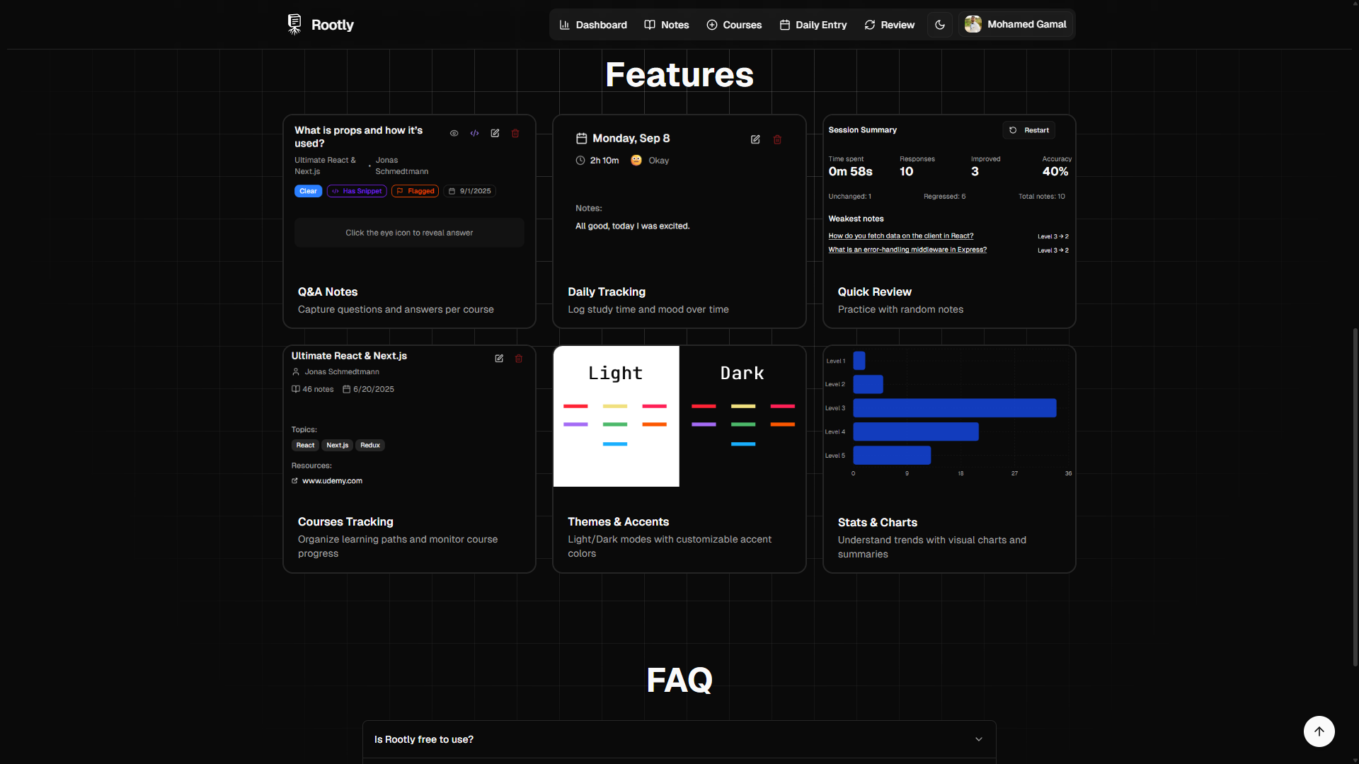 Elegant, data-driven learning tracker that centralizes note-taking, course organization, progress tracking, and active recall through structured review sessions with performance analytics.